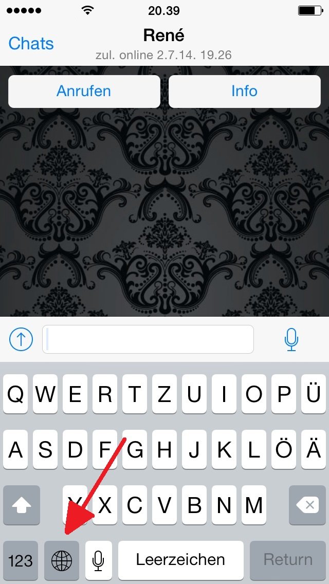 Um Emoji-Tastatur verwenden zu können, sollen Sie dann die Tastatur dementsprechend einrichten. Die WhatsApp-Smileys erreichen Sie über das kleine Globus-Symbol, das sich in der linken Ecke ihres iPhone Displays befindet.