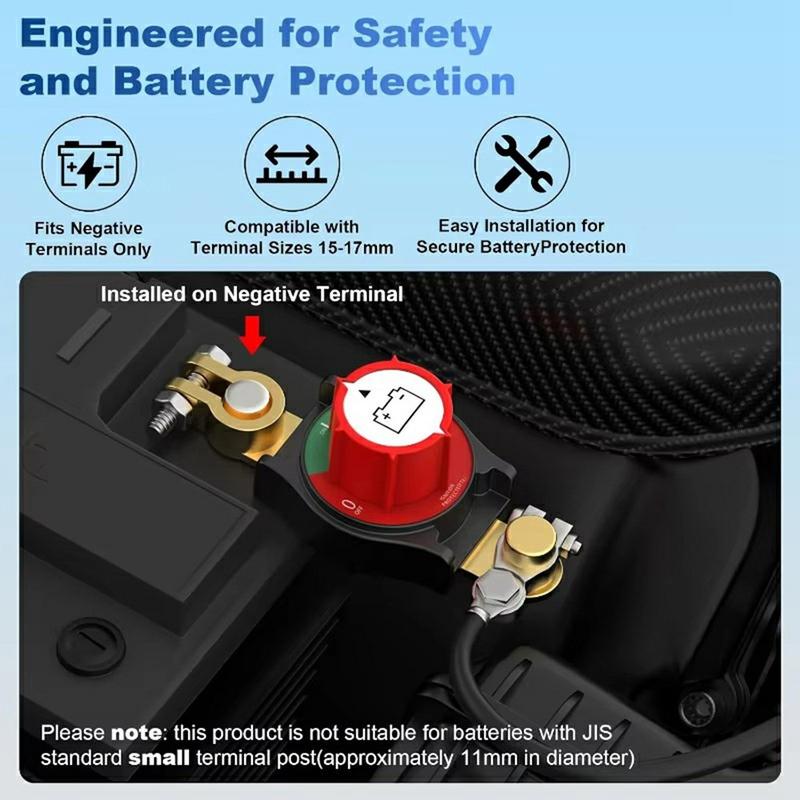 Verwenden Sie ihn in einem Auto, das mehrere Tage am Stück geparkt ist, in einem Lkw, der während der Wartung eine zuverlässige Batterieabschaltung benötigt, in einem Wohnmobil während der Lagerung außerhalb der Saison oder in einem Boot, um unerwünschten Stromverbrauch zu verhindern, wenn es nicht in Gebrauch ist. Er ist auch nützlich für Campingausrüstung und andere batteriebetriebene Systeme, bei denen eine schnelle Trennung wichtig ist.