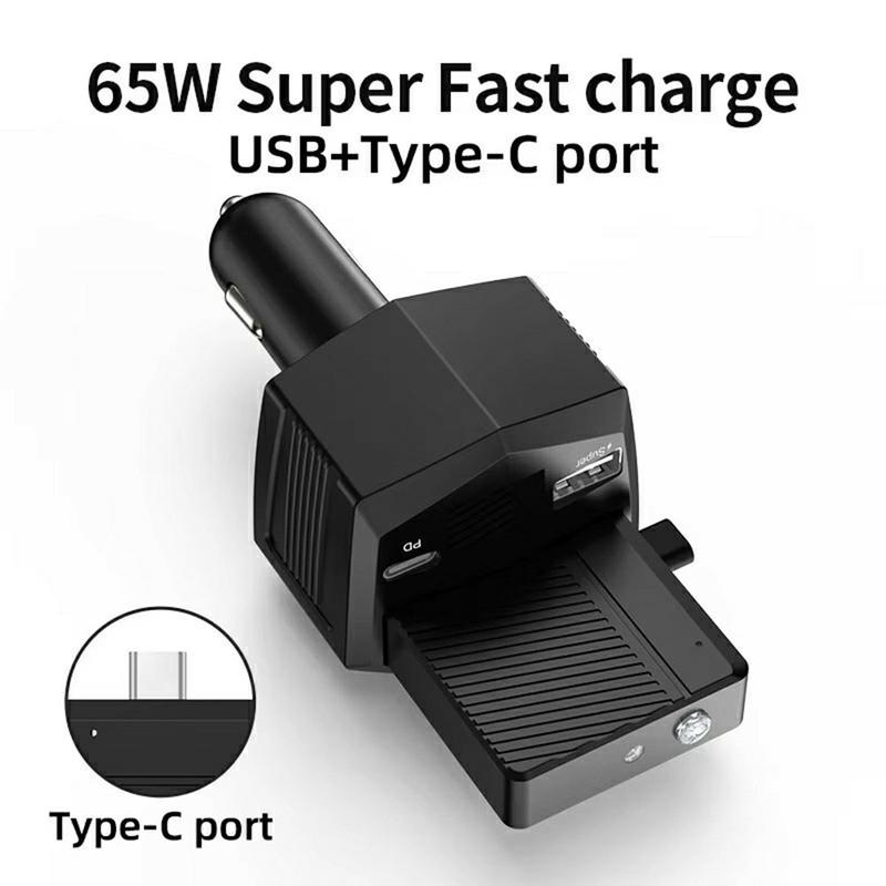2-in-1 65W Schnelles Autoladegerät mit USB-C PD, USB-A Anschlüssen und 2000mAh USB-C Power Bank mit Taschenlampe