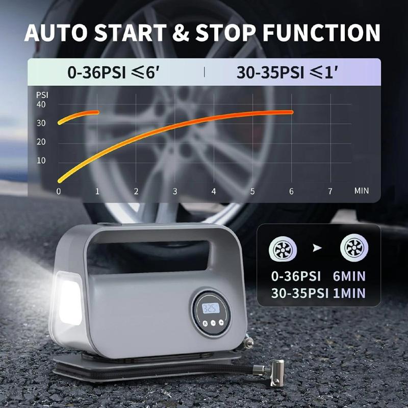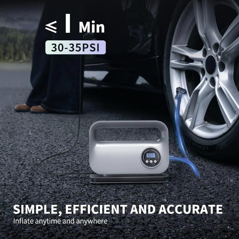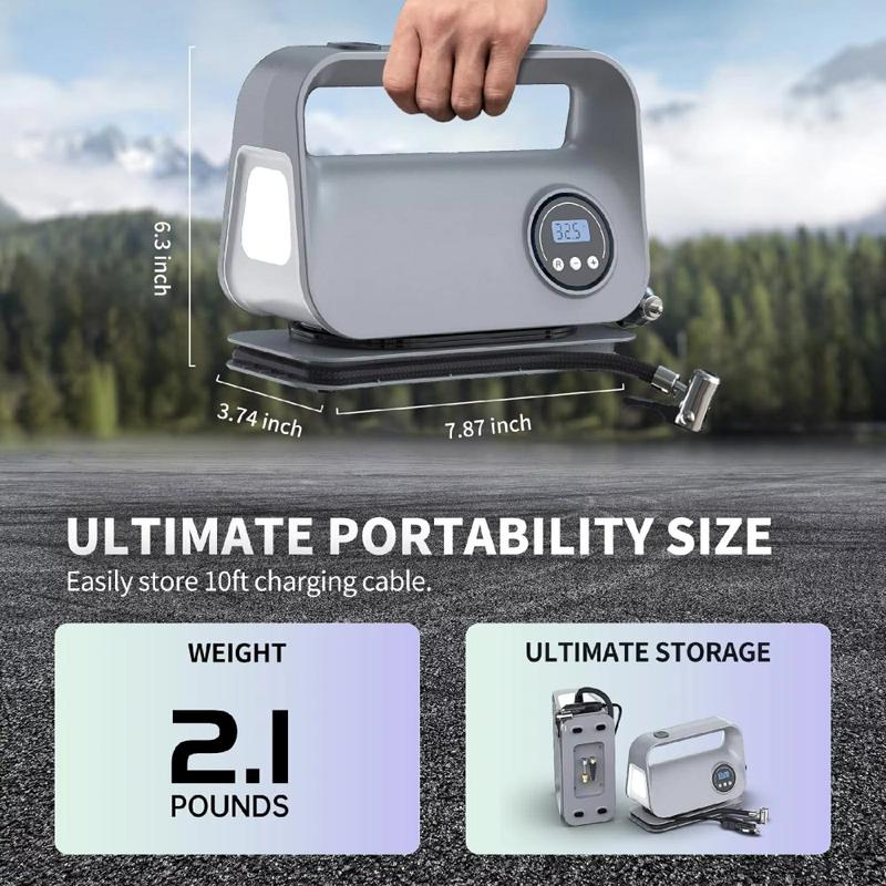- Tragbar und leicht - kompakt genug, um im Handschuhfach oder Kofferraum verstaut zu werden, und gleichzeitig leistungsstark genug, um mehrere Aufpumpaufgaben zu bewältigen.