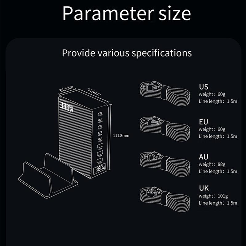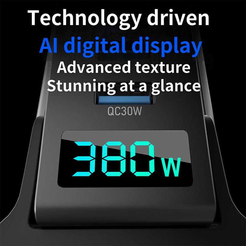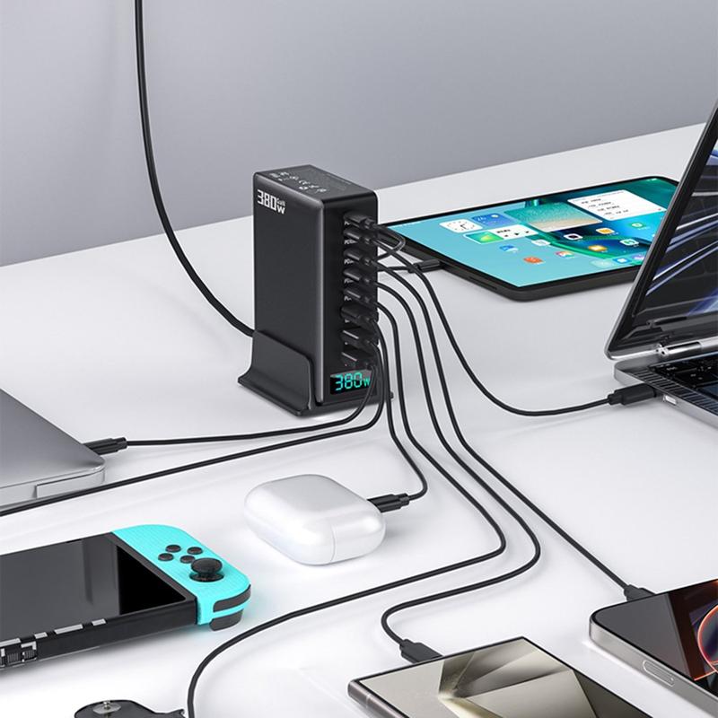 Versorgen Sie Ihre gesamte Einrichtung mit Strom - mit einer leistungsstarken 380W-GaN-Desktop-Ladestation, die für moderne Haushalte und Büros entwickelt wurde. Mit 8 Anschlüssen (5x USB-C + 3x USB-A) und einer digitalen Stromanzeige können Sie Laptops, Telefone, Tablets, Kopfhörer, Powerbanks und mehr gleichzeitig aufladen - und dabei Ihren Schreibtisch sauber und organisiert halten. Die GaN-Technologie sorgt für eine starke Leistung in einem kompakten Format, und die integrierten Sicherheitsvorkehrungen sorgen für einen stabilen und zuverlässigen Ladevorgang.