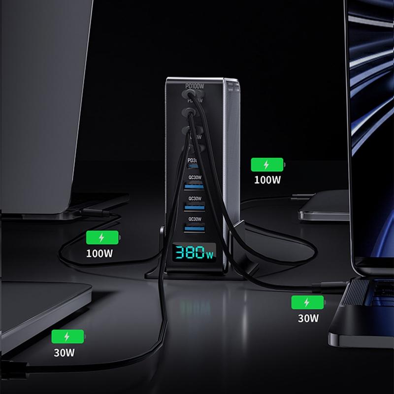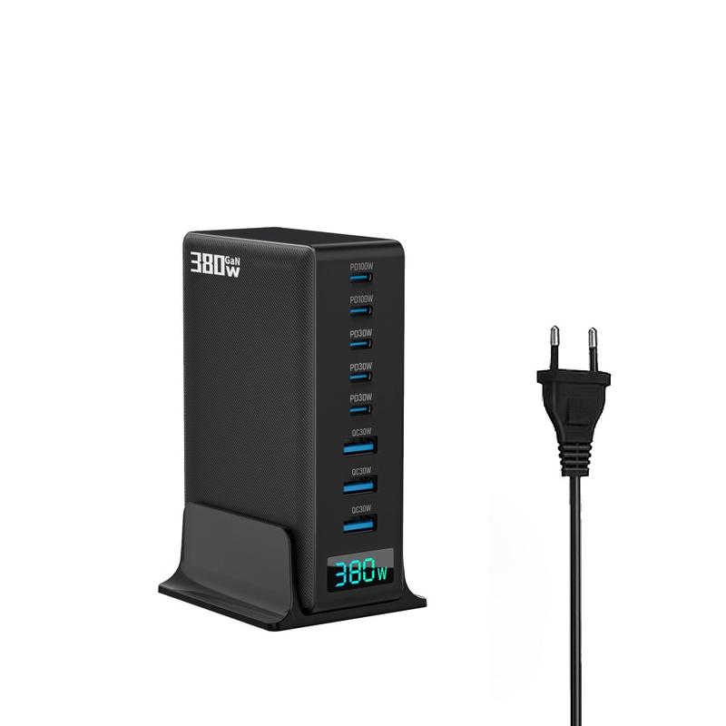 380W GaN Desktop-Ladestation mit digitaler Leistungsanzeige - 8 Anschlüsse (5x USB-C + 3x USB-A), bis zu 100W USB-C Schnellladegerät