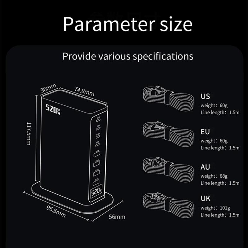 520W GaN 5.0 Desktop-Ladestation mit digitaler Leistungsanzeige - 8 Ports (4x USB-C bis zu 100W + 4x USB-A) Schnellladegerät, PPS/PD/QC