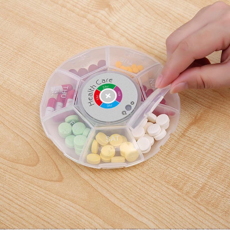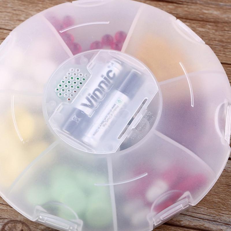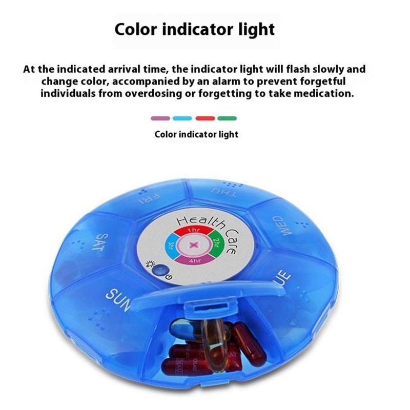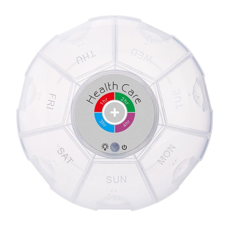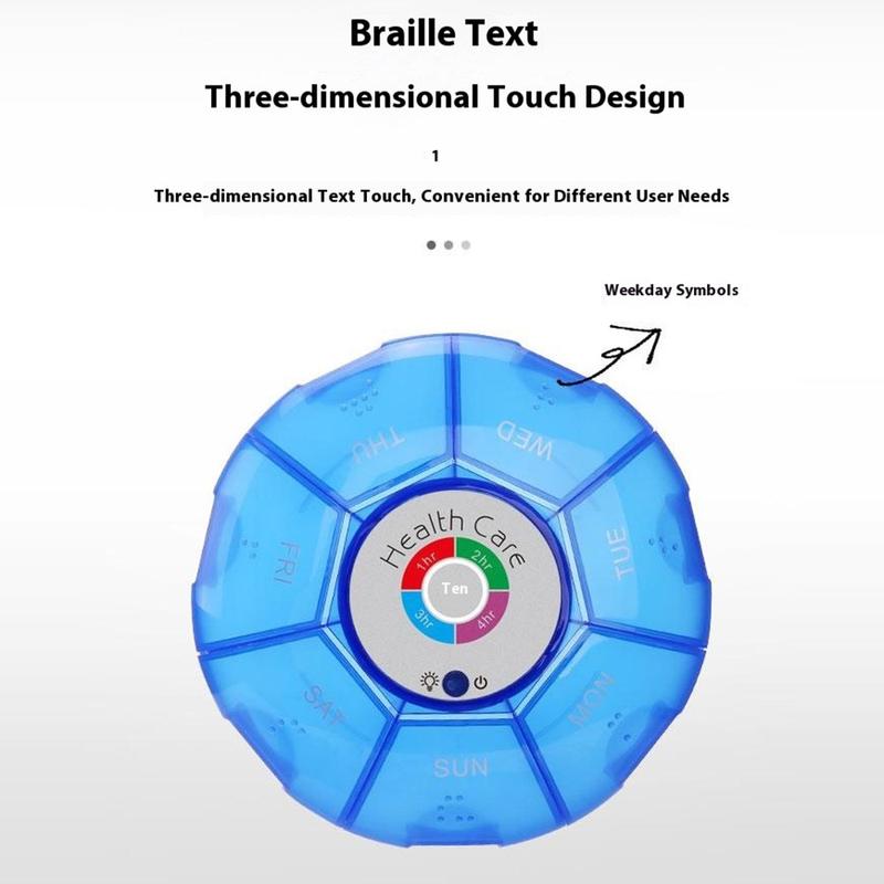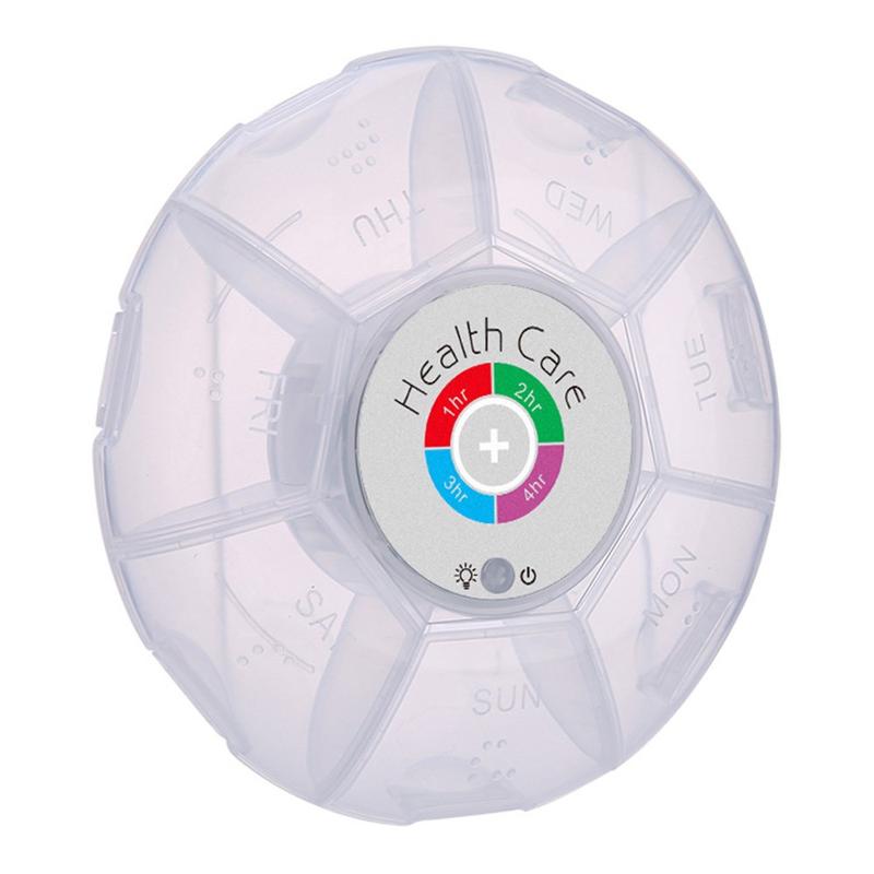Behalten Sie den Überblick über jede Einnahme, auch wenn Sie unterwegs sind. Diese runde Pillenbox mit sieben Fächern kombiniert farbwechselnde LEDs mit akustischen Signalen. Sie können bis zu fünf Erinnerungen in 1-, 2-, 3- oder 4-Stunden-Intervallen programmieren. Blindenschrift und erhabene Wochentagssymbole sorgen für ein übersichtliches Layout, während eine feuchtigkeitsdichte, stoßfeste Hülle die Tabletten in der Handtasche oder im Handgepäck schützt.