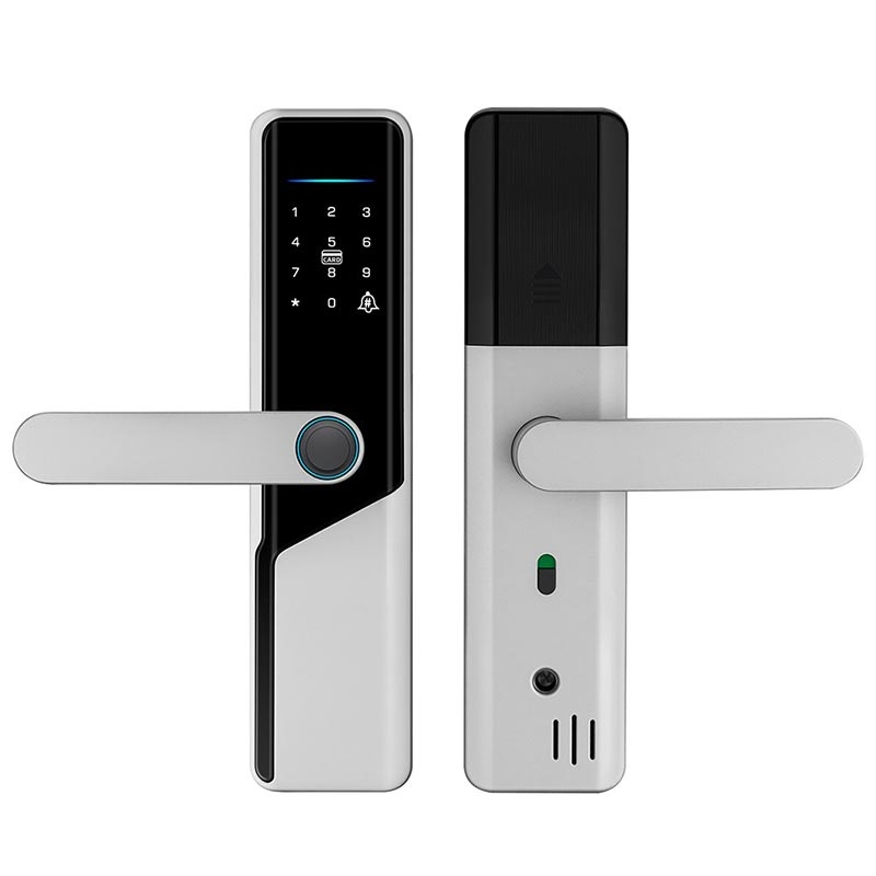 Erhöhen Sie die Sicherheit Ihres Zuhauses mit dem A1 Tuya WiFi Fingerprint Smart Door Lock. Dieses fortschrittliche elektronische Schloss bietet mehrere Zugriffsmethoden, einschließlich Fingerabdruckerkennung, dynamischen Passwörtern und NFC, und bietet sowohl Komfort als auch robusten Schutz. Das schlichte, silberne Design passt zu verschiedenen Türstilen und ist damit die ideale Wahl für moderne Häuser.