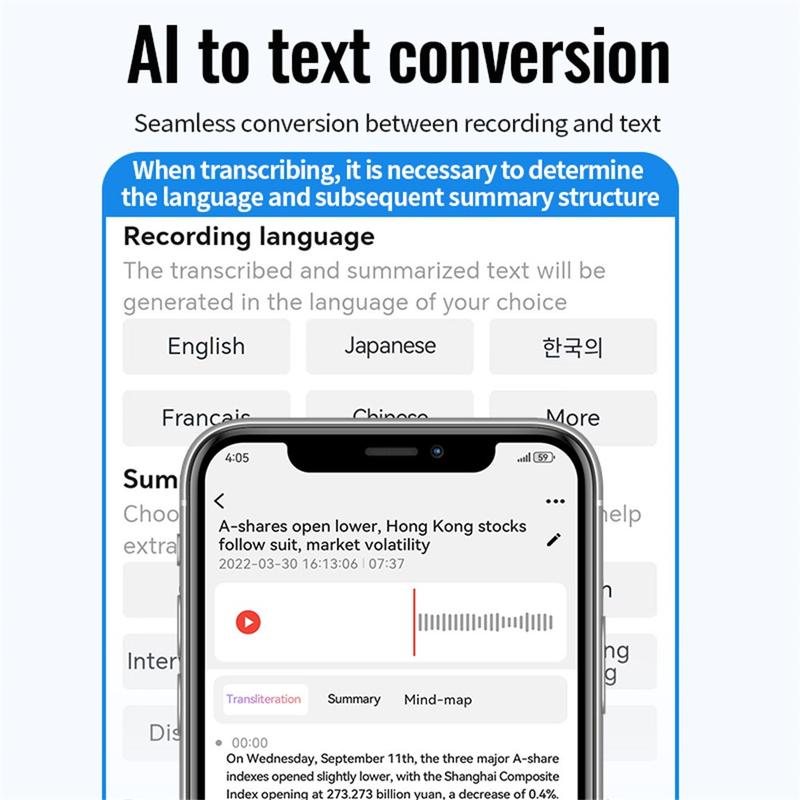 Gekoppelt mit der AIREC-APP über Bluetooth kann dieses Diktiergerät Sprache in 188 Sprachen in Echtzeit in Text umwandeln. Es bietet auch sofortige Übersetzungen, was es zu einem unverzichtbaren Werkzeug macht, um Sprachbarrieren im Geschäftsleben oder auf Reisen zu überwinden.