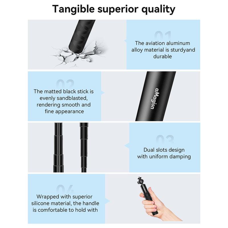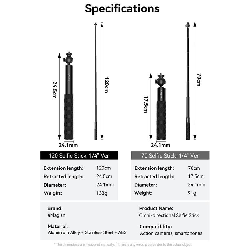 Erfassen Sie jeden Winkel mit dem AMAGISN 120cm Sportkamera-Selfie-Stick, der für DJI-, GoPro- und Insta360-Kameras entwickelt wurde. Mit einer 360°-Winkelverstellung ermöglicht dieser Selfie-Stick kreative Freiheit und perfekte Aufnahmen aus jeder Perspektive. Er ist aus luftfahrttauglichem Aluminium gefertigt und ist sowohl robust als auch leicht, was ihn ideal für den Einsatz unterwegs macht. Der zweistufige Verriegelungsmechanismus sorgt für Stabilität, während die Edelstahlschraube für eine sichere Befestigung sorgt. Dank des 1/4"-Gewindeanschlusses ist es mit Stativen kompatibel.