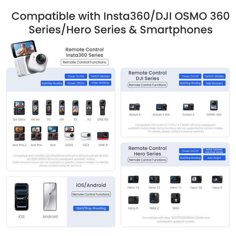 - Breite Kompatibilität - funktioniert mit iOS- und Android-Smartphones und unterstützt Insta360-, GoPro Hero- und DJI-Actionkameras