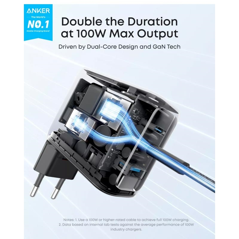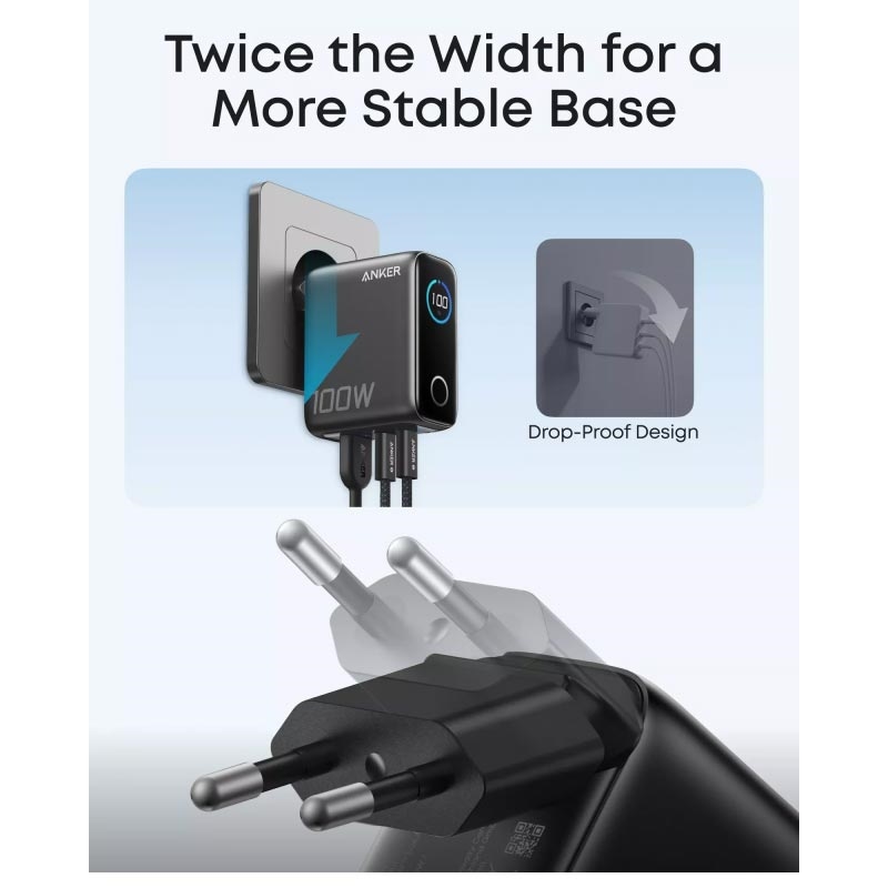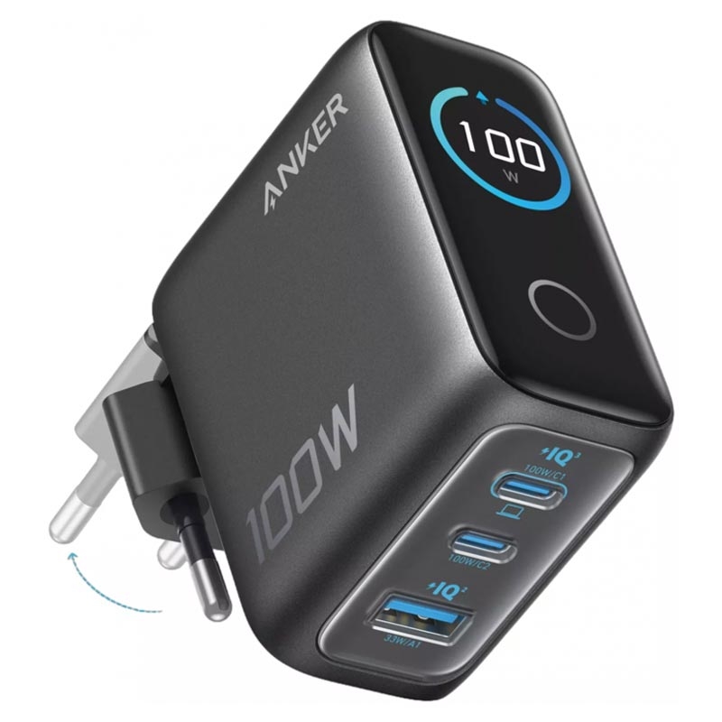Das Anker 100W GaN-Ladegerät mit Smart-Display ist eine leistungsstarke und kompakte Ladelösung für Nutzer, die mehrere Geräte gleichzeitig schnell und effizient aufladen möchten. Mit 2 USB-C-Anschlüssen, 1 USB-A-Anschluss, fortschrittlicher GaN-Technologie und einem integrierten Digitaldisplay bietet es Ihnen eine intelligentere und bequemere Möglichkeit, Laptops, Smartphones, Tablets, Ohrhörer und andere Alltagsgeräte mit Strom zu versorgen.