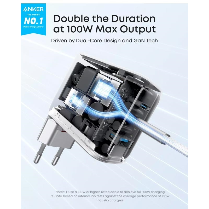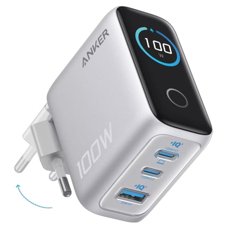 Das Anker 100W GaN-Ladegerät mit Smart-Display ist eine leistungsstarke und kompakte Ladelösung für Nutzer, die mehrere Geräte gleichzeitig schnell und effizient aufladen möchten. Mit 2 USB-C-Anschlüssen, 1 USB-A-Anschluss, fortschrittlicher GaN-Technologie und einem integrierten Digitaldisplay bietet es Ihnen eine intelligentere und bequemere Möglichkeit, Laptops, Smartphones, Tablets, Ohrhörer und andere Alltagsgeräte mit Strom zu versorgen.