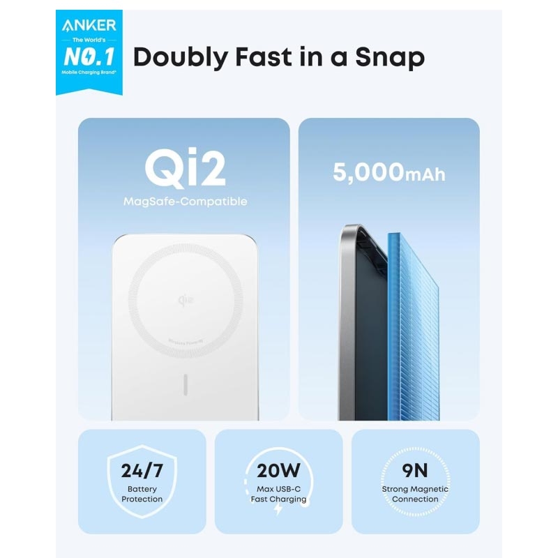 • Anker Nano Slim Magnetische Powerbank 5000mAh mit Qi2-Schnellladefunktion und USB-C-Anschluss, ultraschlankes Design