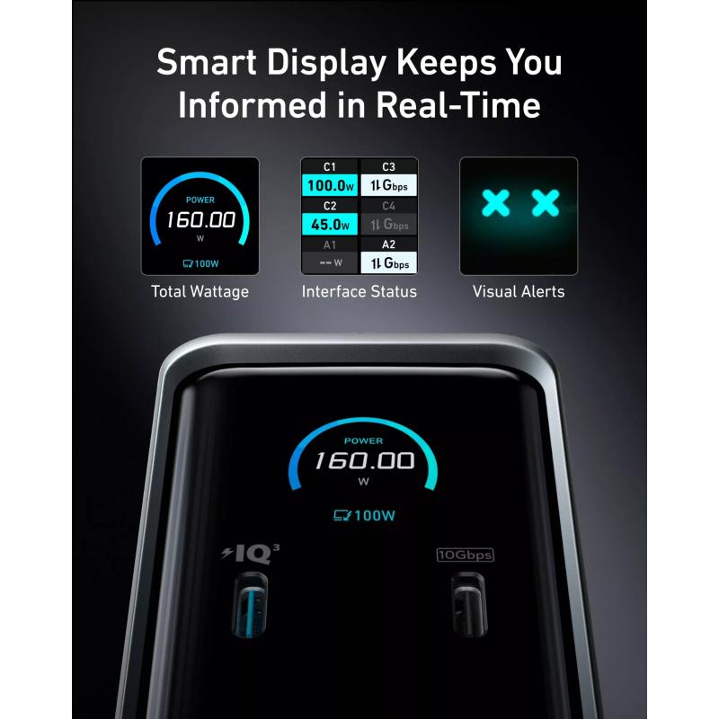 - 160 W Shared Output - Vier USB-C-Anschlüsse liefern jeweils bis zu 100 W, während sich fünf USB-A-Anschlüsse 12 W für Telefone, Laufwerke und Zubehör teilen.