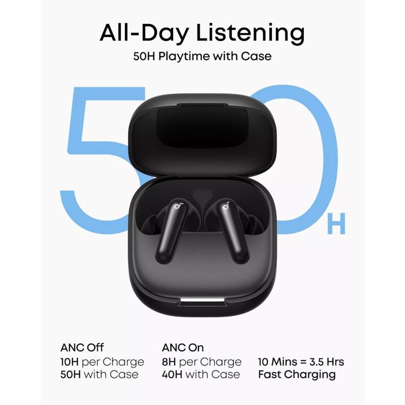 Mit bis zu 10 Stunden Wiedergabezeit mit einer einzigen Ladung und insgesamt bis zu 50 Stunden mit dem Ladecase sind die Soundcore R60i NC für den ausgiebigen täglichen Gebrauch ausgelegt. Die Schnellladefunktion sorgt für zusätzlichen Komfort und ermöglicht bis zu 3 Stunden Hörgenuss nach nur 10 Minuten Ladezeit. Dank der Schutzklasse IP55 (Wasser- und Staubschutz) sind die Ohrhörer zudem eine zuverlässige Wahl für das Training, den Einsatz im Freien und den täglichen Gebrauch.