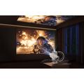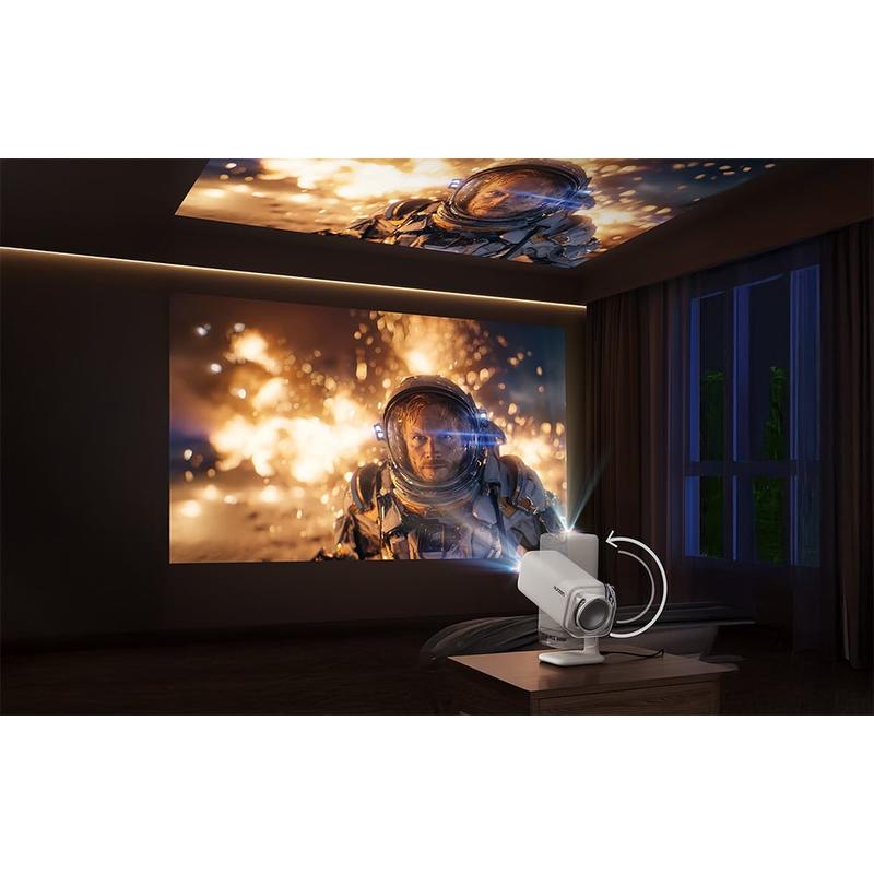 Die Einrichtung ist schnell und ohne Hände möglich. Real-Time Focus verwendet ToF-Entfernungsmessung, um das Bild scharf zu halten, während die elektrische Trapezkorrektur die Geometrie automatisch anpasst, wenn der Projektor geneigt ist. Die automatische Bildschirmausrichtung passt das Bild an Ihre Projektionsfläche an, und die automatische Hindernisvermeidung sorgt für ein klares Bild, wenn etwas im Weg ist. Der verstellbare Sockel (bis zu 110 Grad) erleichtert die Projektion an eine Wand oder Decke, und dank des kompakten Designs und der USB-C-Stromversorgung können Sie das Gerät mit einem geeigneten PD-Ladegerät oder einer Powerbank auch im Freien verwenden.