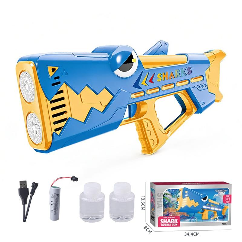 Automatische Seifenblasenpistole Hai für Kinder mit 24 Düsen und LED-Beleuchtung, über USB aufladbarer Seifenblasen-Blaser