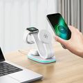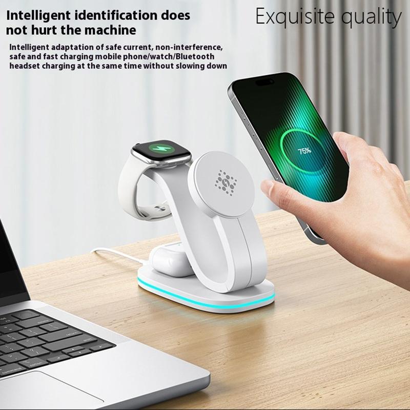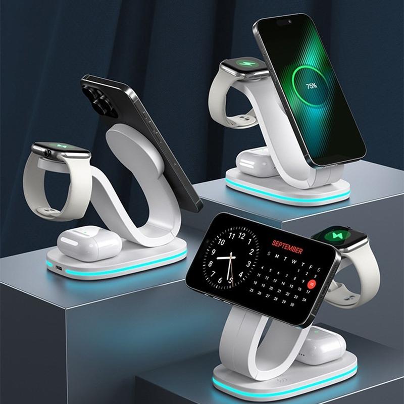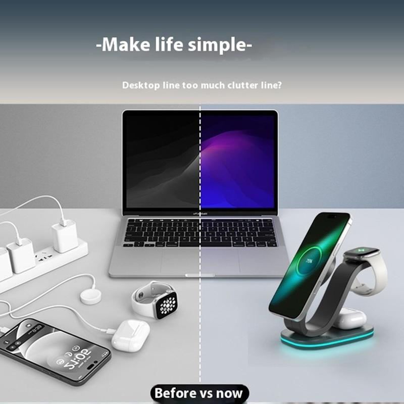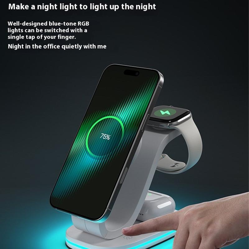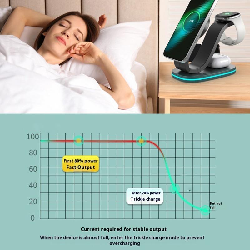 Ein einziger Ständer, der kabelloses Schnellladen mit 15 W ermöglicht, Ihre Smartwatch mit 2 W auflädt, Ihre Ohrhörer mit 3 W versorgt und gleichzeitig als sanftes Nachtlicht dient, sorgt für Ordnung auf dem Schreibtisch.