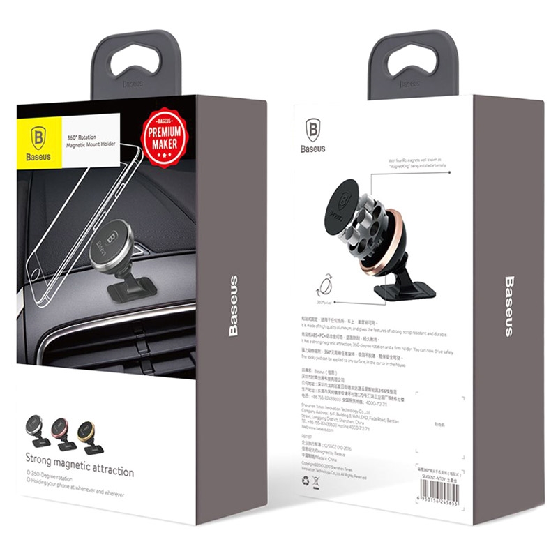 Das kompakte Design, die einfache Installation und die Praktikabilität, die Ihnen die universelle magnetische Autohalterung von Baseus bietet. Sie können es auf jeder ebenen Fläche anbringen, während die 360-Grad-Drehung es Ihnen ermöglicht, Ihr Smartphone in einem perfekten Betrachtungswinkel auszurichten. Ein starker Neodym-Magnet sorgt für einen festen Halt Ihres Geräts und verhindert ein Wackeln auf holprigen Straßen.
