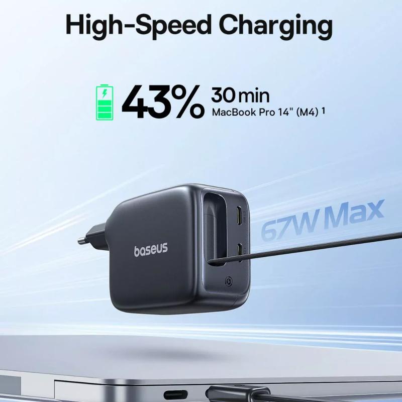 Dieses Ladegerät ist ideal, wenn Sie mehrere Geräte gleichzeitig aufladen möchten, ohne mehrere Adapter und Kabel mit sich herumtragen zu müssen. Die 67-W-Ausgangsleistung eignet sich zum schnellen Aufladen von Laptops, während zusätzliche USB-C-Anschlüsse gleichzeitig Telefone und Zubehör unterstützen. Das integrierte einziehbare Kabel sorgt für Ordnung und reduziert Kabelsalat, sodass es sich perfekt für Reisen und den täglichen Gebrauch am Arbeitsplatz eignet.