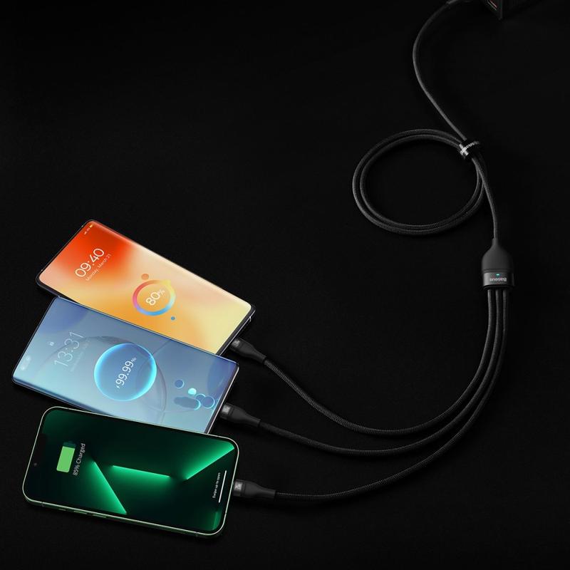 Laden Sie mehr Geräte mit weniger Kabeln mit dem Baseus Flash Series 3-in-2 Schnellladekabel. Dieses intelligente Multi-Anschlusskabel verfügt über zwei Eingänge (USB-A und USB-C) und drei Ausgänge (USB-C, Lightning und Micro-USB) für eine breite Kompatibilität mit Smartphones, Tablets, Zubehör und mehr. Integrierte Erkennungschips helfen dabei, Strom und Spannung sicher zu verteilen, während LED-Ladeanzeigen den Schnellladestatus auf einen Blick anzeigen. Die strapazierfähige Nylon-Ummantelung und die verstärkte Konstruktion machen es zu einem zuverlässigen Alltags-Kabel für zu Hause, im Büro, auf Reisen oder im Auto.