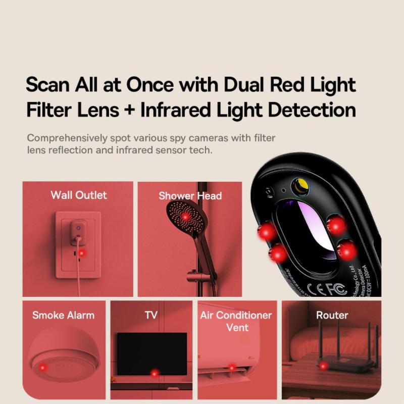 - Doppelt aufgerüsteter 3D-Sensor-Chip: Präzise Erfassung versteckter Überwachungsgeräte mit erhöhter Empfindlichkeit, so dass keine Spionagekamera unentdeckt bleibt.