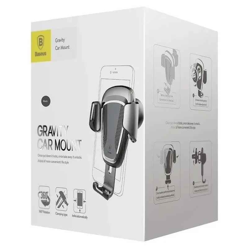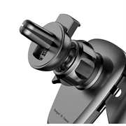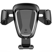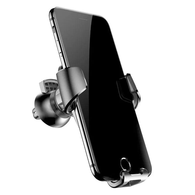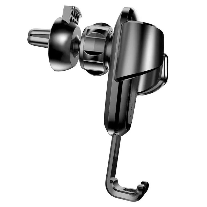 Gravitations-Telefonhalter von Baseus, der auf dem Lüftungsgitter des Autos montiert wird. Der Verstellbereich des Halters beträgt 360 Grad. Geeignet für Telefone mit einer Breite von 63 bis 88 cm. Die seitlichen Klemmen der Halterung passen sich automatisch an die Breite des Handys an. Die ausgeschnittene Schiene ermöglicht es, das Ladegerät anzuschließen.