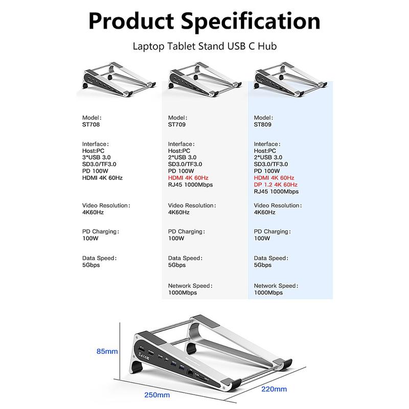 Mit Unterstützung für 4K@60Hz-Videoausgabe und 100W Power Delivery Pass-Through-Laden versorgt der ST708 Ihren Laptop mit Strom, während Sie Ihr Display auf einen externen Monitor erweitern. Die Struktur aus Aluminiumlegierung mit Stützrohren aus Edelstahl sorgt für Stabilität und Langlebigkeit und eignet sich somit für Heimbüros, kreative Arbeitsplätze und Reiseeinrichtungen.