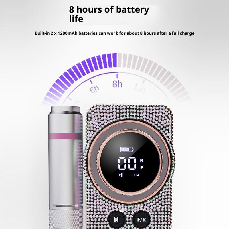 Mit einem Hochgeschwindigkeitsmotor, der bis zu 35.000 U/min erreicht, sorgt sie für einen gleichmäßigen und konsistenten Betrieb beim Formen, Feilen, Verfeinern und der allgemeinen Nagelpflege. Über das LCD-Display lassen sich Drehzahl, Akkustand, Drehrichtung und Pausenstatus leicht überwachen, während der Schnellverschlussgriff einen einfachen Bohrerwechsel ohne zusätzliches Werkzeug ermöglicht. Der wiederaufladbare Akku ermöglicht eine Betriebsdauer von bis zu 8 Stunden und eignet sich somit ideal für längere Anwendungen zu Hause, im Salon oder unterwegs.