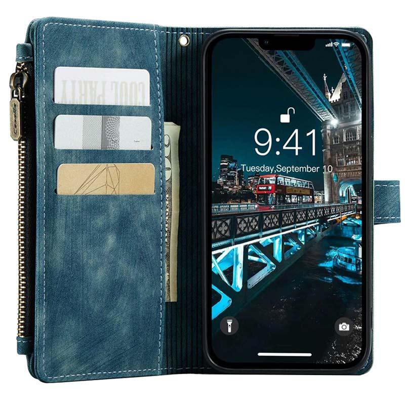 Diese multifunktionale Brieftaschenhülle für das iPhone 14 Plus wird Sie sprachlos machen! Entworfen mit zehn Kartenfächern, einem Geldfach und einer Reißverschlusstasche - genug, um Ihre wichtigsten Dinge überall hin mitzunehmen! Es besteht aus einem hochwertigen Polyurethan und einem inneren TPU-Material, das mit einem Magnetverschluss gesichert ist. Außerdem wird es mit einer Handschlaufe für müheloseres Tragen geliefert und kann als Ständer verwendet werden, um Videos freihändig anzusehen.