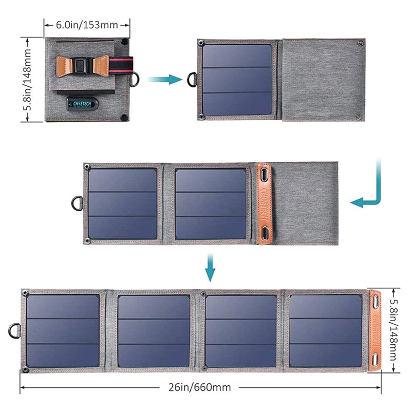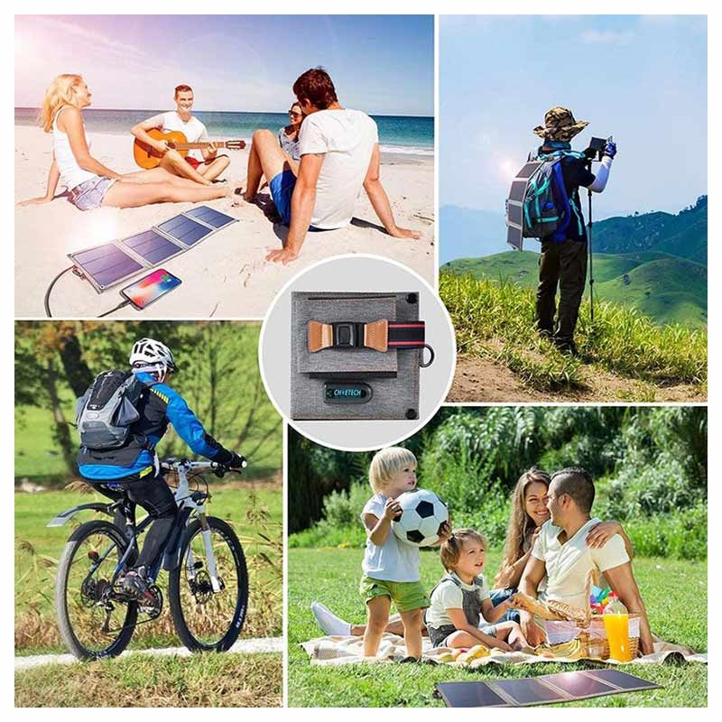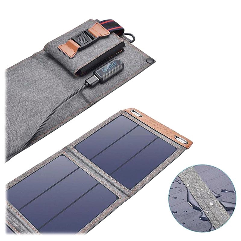 Choetech Solarpanel mit einer Gesamtleistung von 14W kann Ihre Geräte sicher und effizient über den USB-A Anschluss aufladen. Laden Sie Ihr Smartphone, Tablet, GPS-Tracker, Ihre Digitalkamera, Ihren MP3-Player oder Ihre Powerbank schnell und einfach mit der Energie der Sonne auf. Ein eingebauter Smart-Chip erkennt automatisch das angeschlossene Gerät und liefert die optimale Leistung, um einen sicheren Ladevorgang zu gewährleisten. Das Choetech Solar-Ladegerät ist ideal für alle Outdoor-Aktivitäten wie Camping, Wandern und Radfahren, und dank der wasserdichten Paneele können Sie es anschließend bei jedem Wetter am Rucksack tragen.