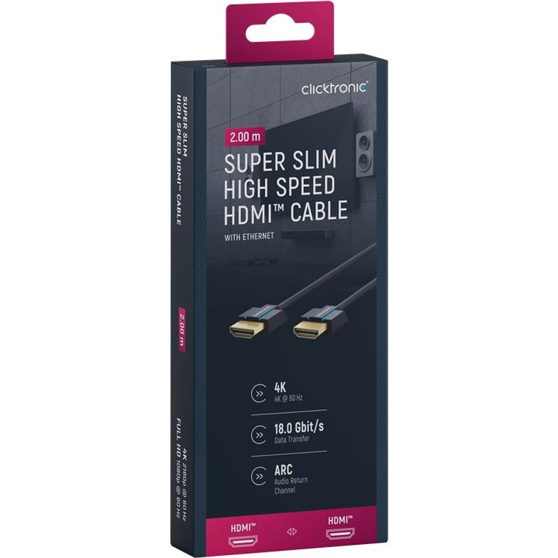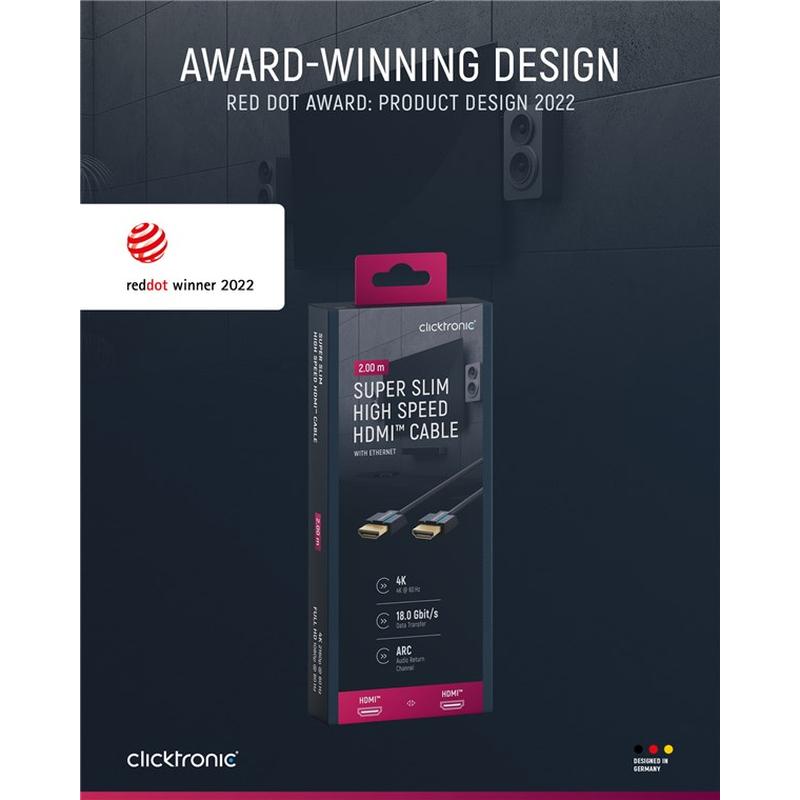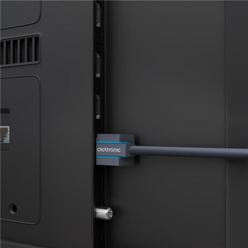Den ultrasmala HDMI™-höghastighetskabeln ansluter TV-apparater och monitorer till t.ex. bärbara datorer, projektorer, beamers eller spelkonsoler som PlayStation eller Xbox för felfria film- och spelupplevelser. UHD-signalöverföring med upp till 4K @ 60 Hz (2160p) och Full HD @ 60 Hz (1080p), Extra smal HDMI™-anslutningskabel för hög flexibilitet vid anslutning och med maximal överföringshastighet på upp till 18 Gbit/s, 24 karat guldpläterade HDMI™-kontakter och avancerad teknik garanterar felfri signalkvalitet utan bildöverföringsfördröjningar för en optimal spelupplevelse. Rena kopparledare och 3-faldig avskärmning för klart ljud och knivskarp video- och bildkvalitet, Clicktronic 4K-kabel med HDMI™ Premium-certifiering garanterar bästa kvalitet. HDMI™-anslutning för alla vanliga funktioner som ARC (audio return channel), HDCP eller 3D-innehåll