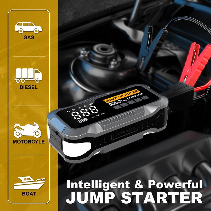 • CY97 Starthilfe für Autos mit 150-PSI-Luftkompressor, USB-A/USB-C-Powerbank / tragbarer 4000-A-Starthilfe und Reifenfüller mit LED-Licht