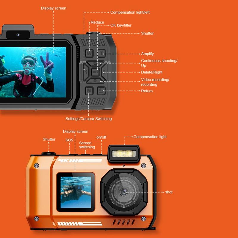 Die wasserdichte Action-Kamera D50 wurde für Outdoor-Abenteuer, Reisen und Wassersport entwickelt und kombiniert ein Dual-Screen-Design mit einfacher Bedienung und langer Laufzeit. Verwenden Sie den vorderen 1,44-Zoll-IPS-Bildschirm für Selfies und Vlogging und den hinteren 2,88-Zoll-IPS-HD-Bildschirm für die Bildausrichtung, Wiedergabe und schnelle Überprüfung. Mit einer Wasserdichtigkeit nach IP68 bis zu 10 m ist sie bereit für Tage am Pool, Schnorcheln und Wanderungen im Regen. Kreative Fotografen werden die 20 speziellen Filtereffekte lieben, während die elektronische Bildstabilisierung dafür sorgt, dass die Aufnahmen auch bei Bewegungen flüssig bleiben. Eine integrierte SOS-Ein-Klick-Funktion sorgt für zusätzliche Sicherheit bei Outdoor-Aktivitäten. Dieses Set enthält außerdem eine 32-GB-TF-Karte und einen Kartenleser, sodass Sie sofort mit dem Filmen beginnen können.