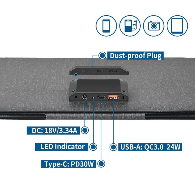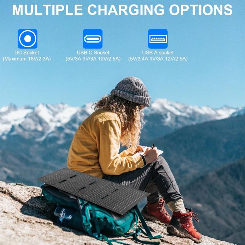 Dank seines kompakten, faltbaren Designs lässt sich dieses Solarladegerät leicht im Rucksack transportieren, im Fahrzeug verstauen oder während der Reise an der Outdoor-Ausrüstung befestigen. Trotz seiner kompakten Größe bietet es eine Ausgangsleistung von bis zu 60W und mehrere Ladeoptionen, darunter DC, USB-A und USB-C, wodurch es sich zum Laden von Smartphones, Tablets, Powerbanks, kleineren Laptops, Kameras und anderen kompatiblen Geräten eignet.