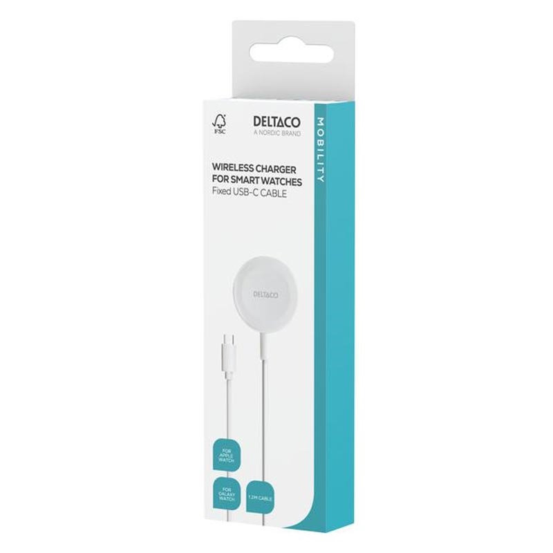 Mit diesem tragbaren kabellosen Ladegerät von Deltaco für Apple Watch und Samsung Galaxy Watch können Sie Ihre Smartwatch ganz einfach aufladen. Es wurde für den täglichen Komfort entwickelt, wird über das fest integrierte 1 m lange USB-C-Kabel angeschlossen und bietet eine einfache Ladelösung für zu Hause, im Büro oder auf Reisen.