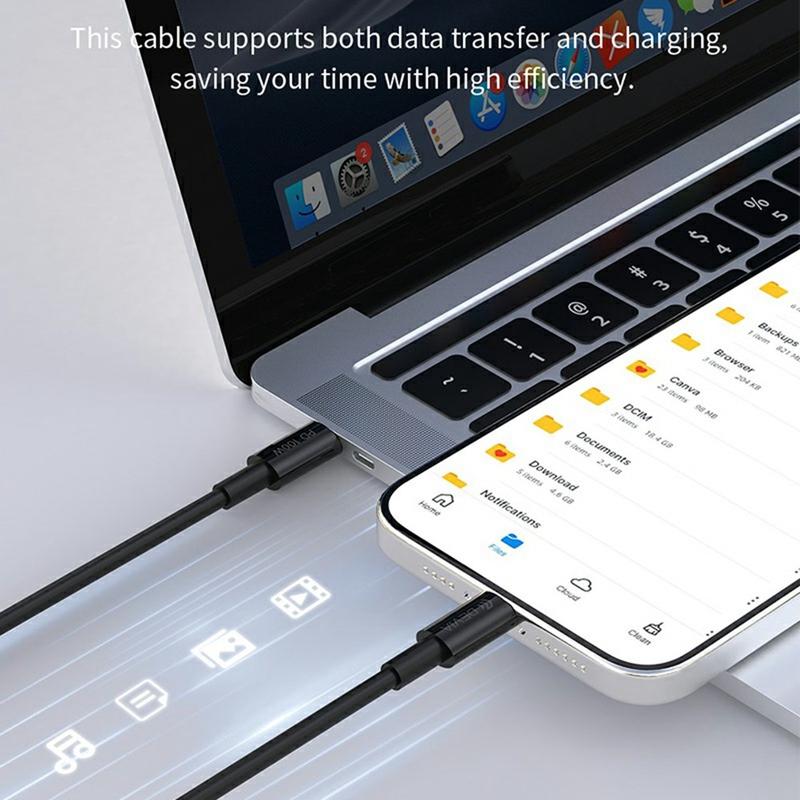 Laden Sie USB-C-Smartphones, Tablets und Laptops schneller mit dem USB-C-zu-USB-C-Kabel der Devia EC317 Smart Series. Es wurde für Power Delivery-Laden mit bis zu 100W und 5A Stromunterstützung entwickelt und ist eine zuverlässige Wahl für moderne Geräte, die eine höhere Leistung benötigen, darunter viele Laptops und Gaming-Geräte. Der flexible TPE-Kabelkörper ist auf tägliche Haltbarkeit ausgelegt, während der verdickte verzinnte Kupferkern für eine stabile Leistung sorgt. Ein integrierter E-Marker-Chip sorgt für die richtige Stromstärke und ermöglicht so ein sichereres Schnellladen und eine effiziente Datensynchronisierung.