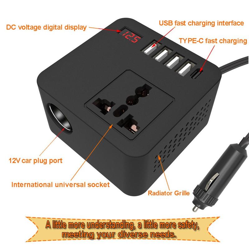 Versorgen Sie Ihre Geräte unterwegs mit Strom - mit dem Digital Display Car Power Inverter, einem kompakten und dennoch leistungsstarken Konverter, der den 12-V- oder 24-V-Gleichstrom Ihres Fahrzeugs in 110-V- oder 220-V-Wechselstrom umwandelt. Er ist mit mehreren Schnellladeanschlüssen, intelligenter Kühlung und vollem Sicherheitsschutz ausgestattet und eignet sich perfekt für Reisen, Camping und den Einsatz in Notfällen.