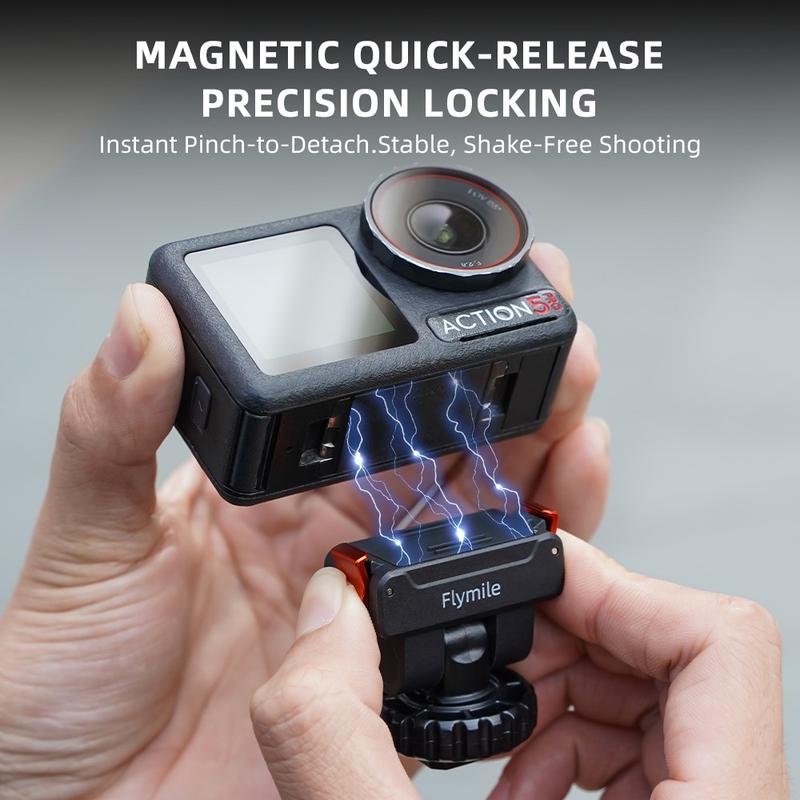 Die magnetische Halterung Flymile verfügt über eine präzise Verriegelungsstruktur für schnelles Anbringen und Entfernen. Das Pinch-Release-Design sorgt für einen festen Halt mit minimalem Wackeln - ideal für stabile Aufnahmen bei Action-Filmen.