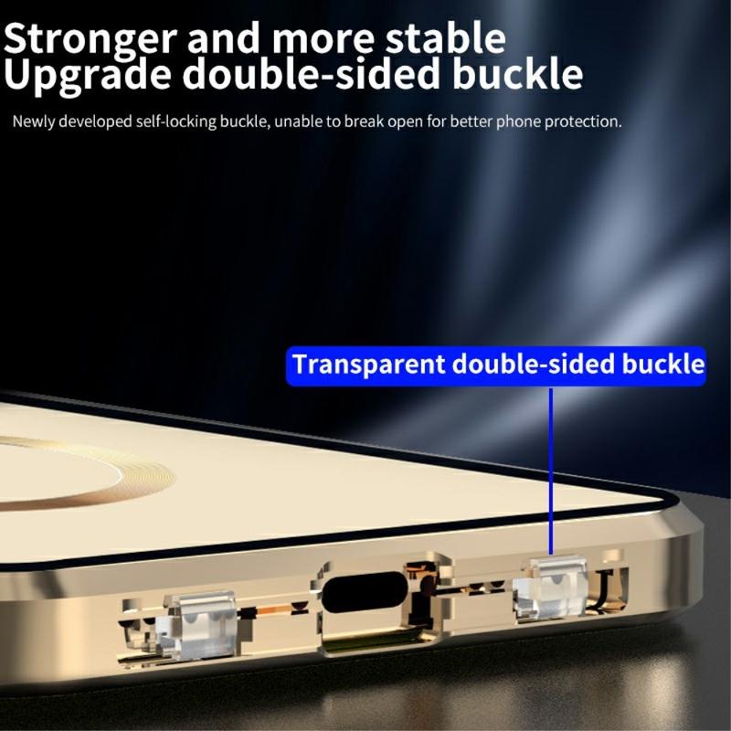 Doppelseitiges gehärtetes Glas+magnetischer Metallrahmen Anti-Drop Case für iPhone 15 kompatibel mit MagSafe Phone Cover mit Schnallenverschluss - Schwarz