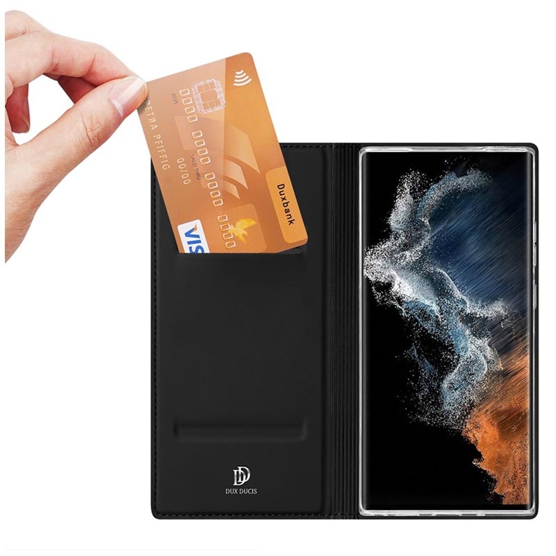 Ausgestatteit einem Kartenfach zur Aufbewahrung Ihres Ausweises oder Ihrer Kreditkarte. Die Dux Ducis Skin Pro Flip Hülle für das Samsung Galaxy S23 Ultra 5G verfügt außerdem über eine Standfunktion zum freihändigen Betrachten Ihrer Lieblingsmedien.