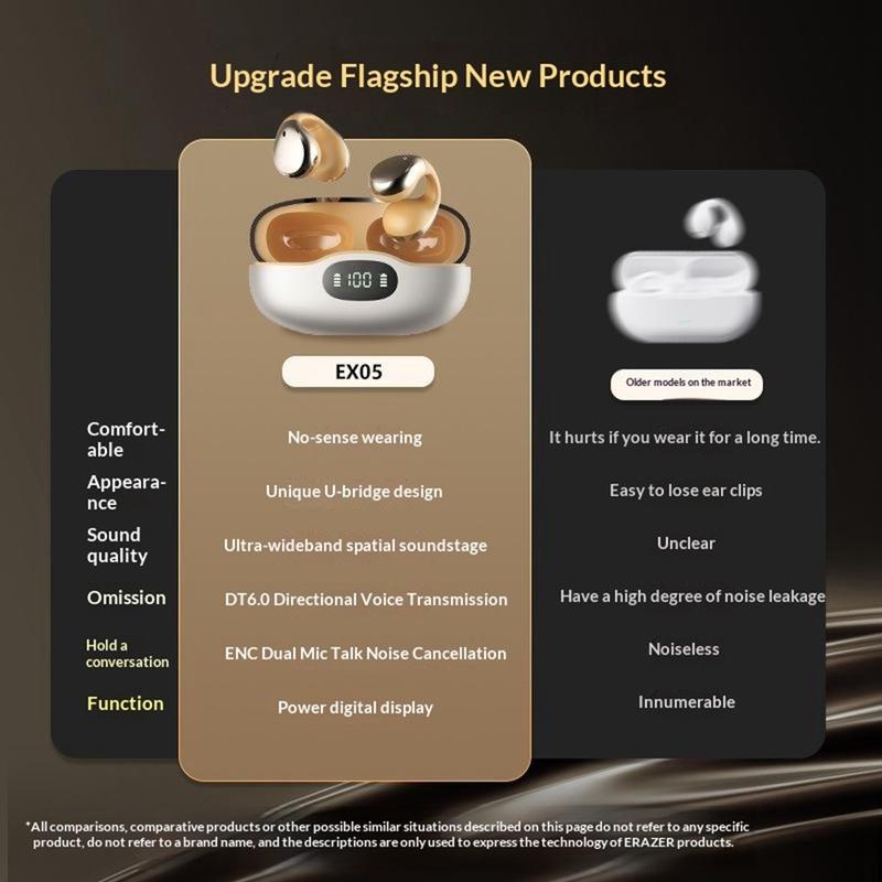 Genießen Sie komfortablen Hörgenuss im Alltag mit den ERAZER EX05 Clip-On-Kopfhörern. Dank ihrer leichten, offenen Clip-On-Bauweise sitzen diese kabellosen Ohrhörer bequem, ohne Druck im Gehörgang auszuüben, und sind somit eine praktische Wahl für Sport, Spaziergänge, den Weg zur Arbeit und den täglichen Gebrauch.