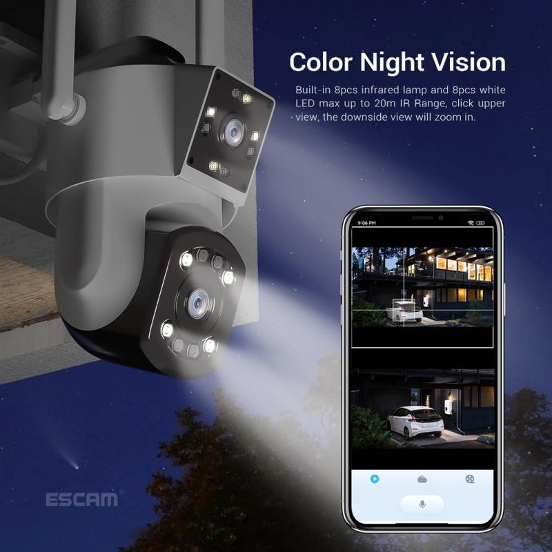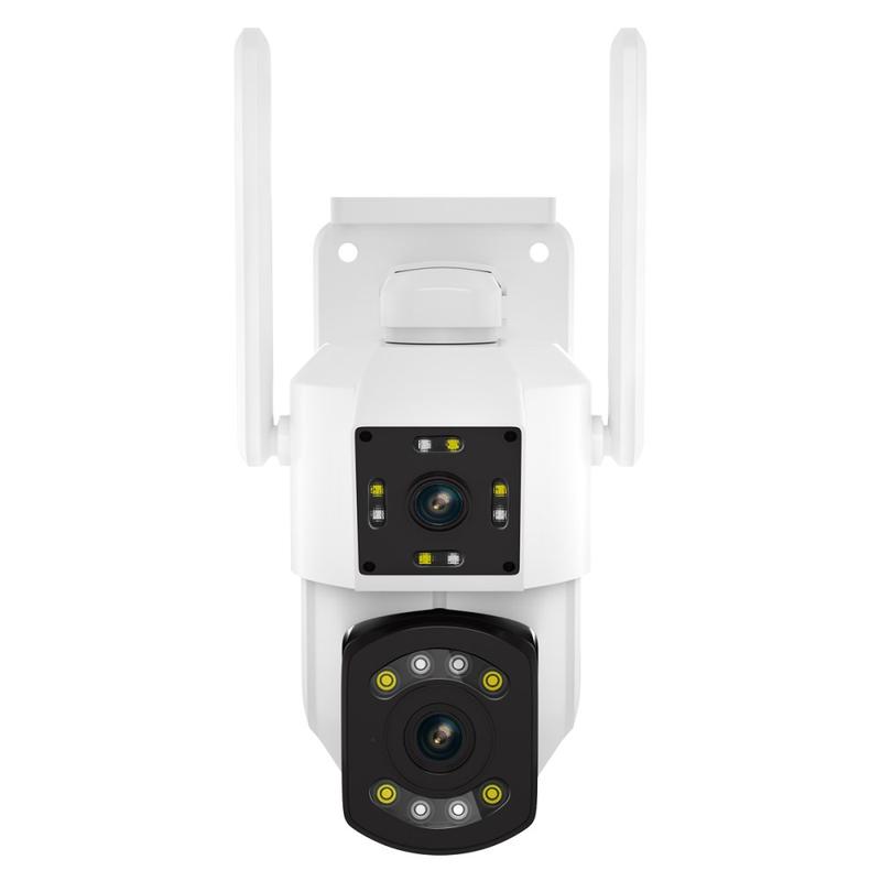 Schützen Sie Eingänge, Terrassen oder Ladenfronten mit einer Kamera, die mehr sieht. Die ESCAM PT210 kombiniert zwei 3-MP-Objektive und eine volle 355°-Schwenk- und 140°-Neigebewegung, um eine nahtlose Doppelbildschirmabdeckung mit einer scharfen Auflösung von 2304 × 1296 zu ermöglichen. Acht Infrarot-LEDs und acht weiße Scheinwerfer schalten automatisch um und ermöglichen so eine scharfe Schwarz-Weiß-Nachtsicht oder Farbaufnahmen bis zu 20 m ohne zusätzliche Scheinwerfer.