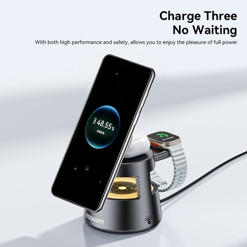 Dieses 4-in-1-Ladegerät von ESSAGER vereint Schnellladung, magnetische Stabilität, sanfte Beleuchtung und Unterstützung für mehrere Geräte in einem einzigen, platzsparenden Design - perfekt für zu Hause, im Büro oder am Bett.