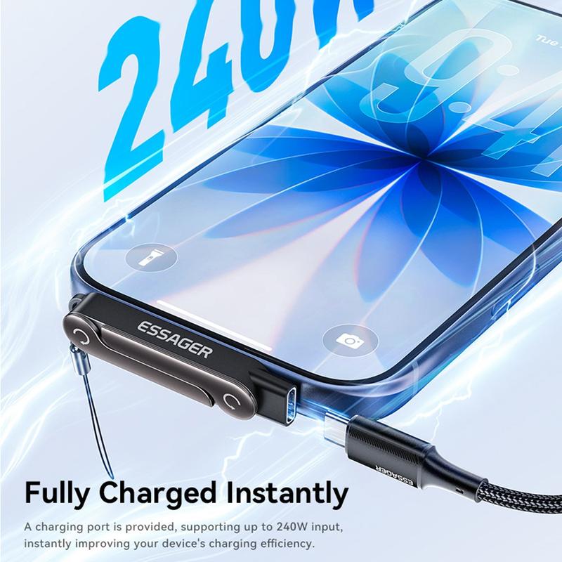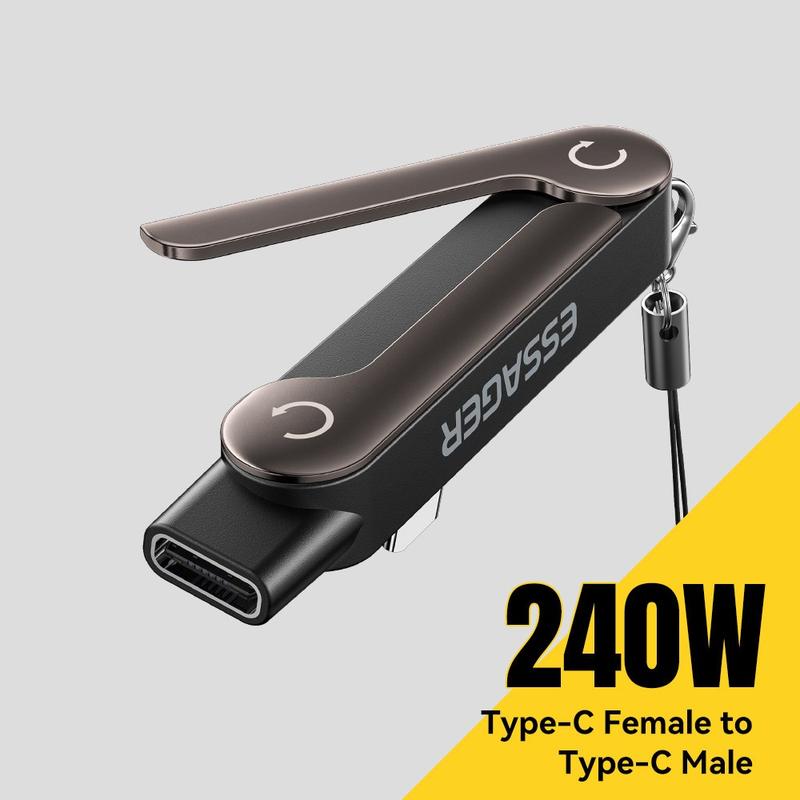 Der ESSAGER USB-C-Buchse-auf-USB-C-Stecker-Adapter ist ein praktisches 2-in-1-Zubehör, das Hochgeschwindigkeitsverbindungen mit einem klappbaren Handyhalter kombiniert. Er wurde für den täglichen Komfort entwickelt und unterstützt eine Ladeleistung von bis zu 240 W sowie eine Datenübertragungsrate von 40 Gbit/s, während das 90-Grad-L-förmige Design für einen bequemeren Kabelwinkel während der Nutzung sorgt. Kompakt, leicht und einfach zu transportieren, ist er eine praktische Lösung für Arbeit, Reisen und tägliche Ladeanwendungen.
