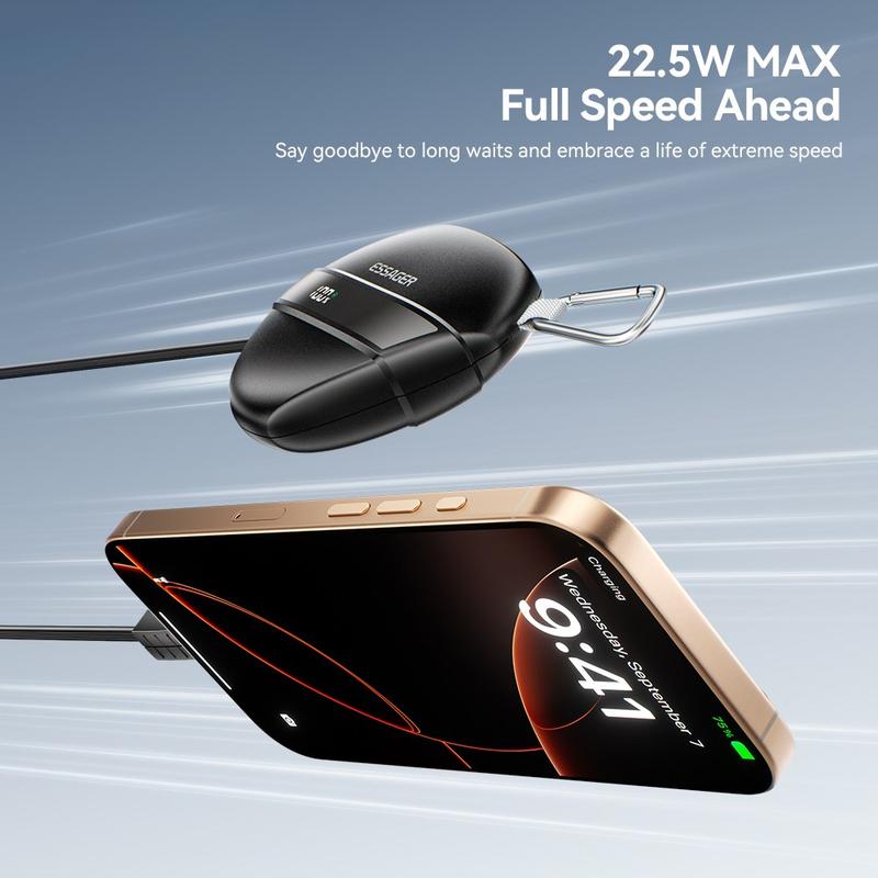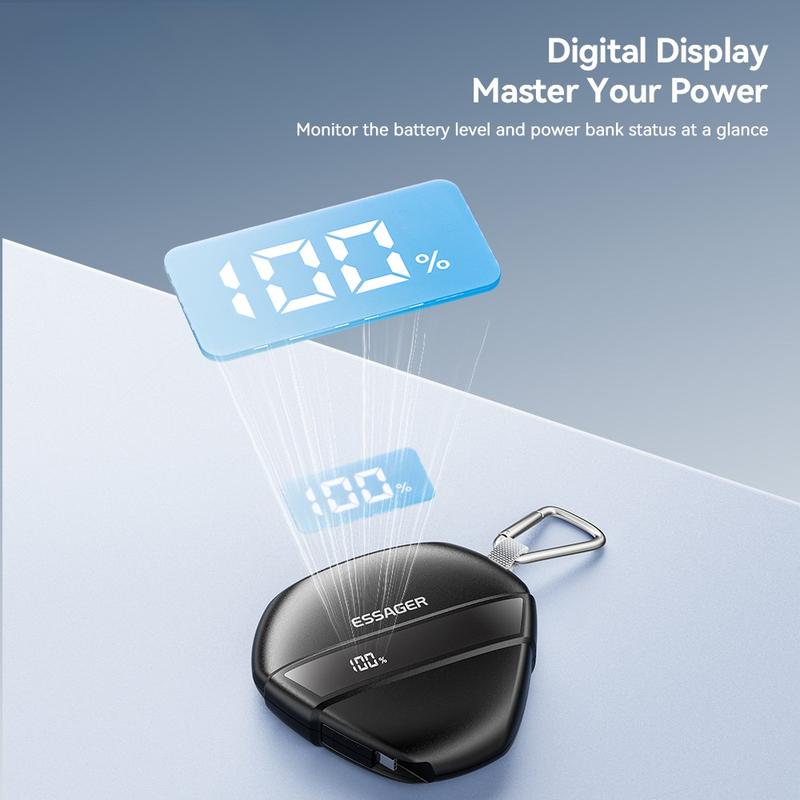 Die ESSAGER 22,5 W Schnelllade-Powerbank bietet Hochgeschwindigkeitsaufladung, ein integriertes Kabel, eine robuste Konstruktion und ein reisefreundliches Design - ein großartiger Begleiter für den täglichen Gebrauch, das Pendeln und Outdoor-Aktivitäten.