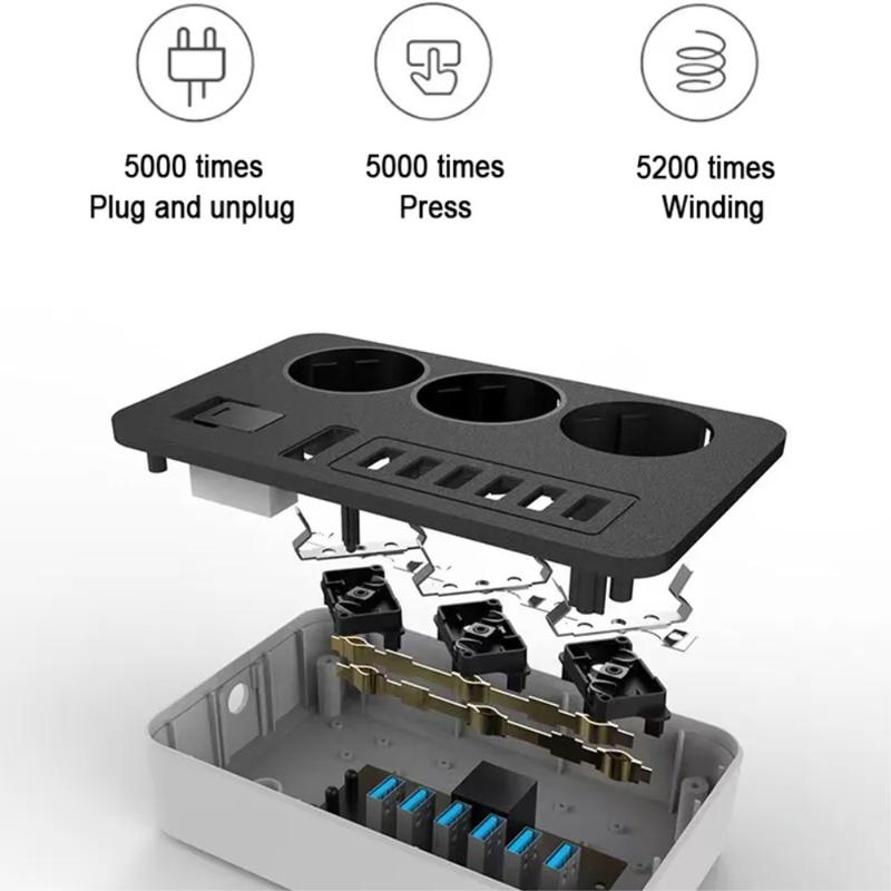 Diese Steckdosenleiste kann mit allen gängigen Steckern verwendet werden. Sie hat eine minimale Wärmeentwicklung und bietet hohe Sicherheit. Stecker und Steckdose bleiben auch nach 10.000 normalen Ein- und Ausstöpseln sicher verbunden.