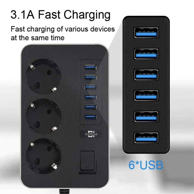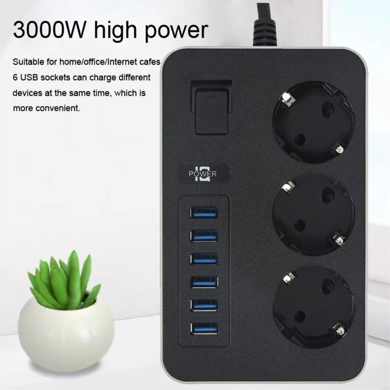 • EU-Stecker 3000W High Power Strip 2m Verlängerungskabel 3 AC Steckdosen mit 6 USB Ausgängen (CE zertifiziert)