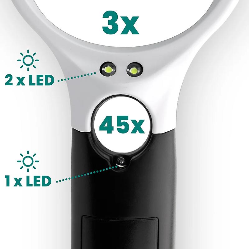 Die everActive MG-01 Lupe mit LED-Hintergrundbeleuchtung ist ein vielseitiges Werkzeug zum Lesen, für Präzisionsarbeiten und für den professionellen Einsatz. Ausgestattet mit zwei Linsen (3× für den allgemeinen Gebrauch und 45× für Mikro-Details) und drei hellen LEDs, sorgt sie für hervorragende Sichtbarkeit bei allen Lichtverhältnissen. Leicht, tragbar und batteriebetrieben ist es der perfekte Begleiter für Senioren, Bastler, Sammler und Techniker.