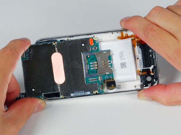 Auf der Hauptplatine neben dem "Nicht entfernen" Aufkleber befindet sich eine kleine goldene Erdungslasche. Beim Hebeln der Hauptplatine sollen Sie SEHR vorsichtig sein, diesen Teil nicht zu beschädigen, denn er ist sehr zerbrechlich. Wenn Sie nach dem Entfernen der Hauptplatine Empfang-Schwierigkeiten haben, überprüfen Sie bitte diese Erdungslasche.