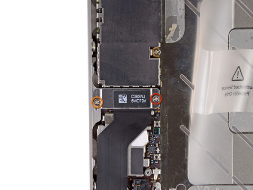 Vor dem Wiedereinbau der Lautsprecherabdeckung Schrauben stellen Sie sicher, dass die Wi-Fi Erdungklammer im iPhone Metalgehäuse schon eingebaut sind, wie im dritten Bild.