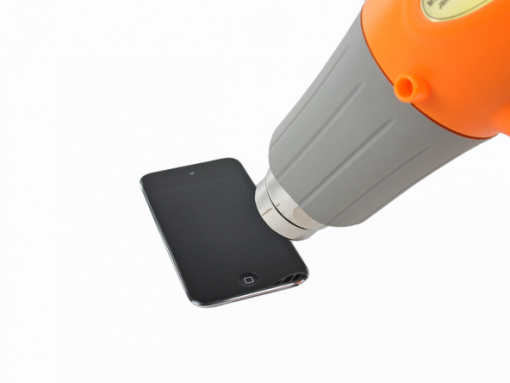 Mit der Heißluftpistole auf niedriger Stufe, beginnen Sie die Erwärmung des unteren Teils des Touch in der Nähe der Home-Taste.